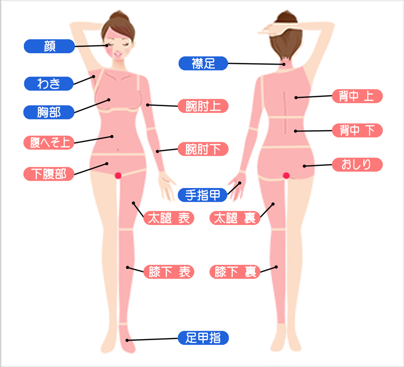 当店では、脚や腕、背中などの比較的面積の広い箇所へは高速SHR照射を行い、面積の小さい箇所へは、E-Light方式を使用しておりますが、お客様のご要望にお応えして照射方式を設定致します。